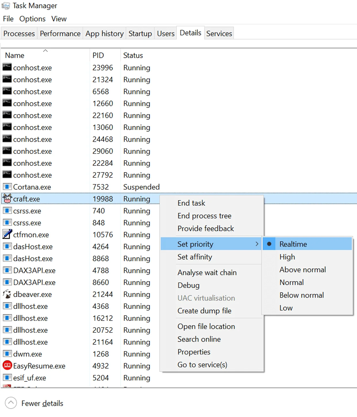 In the Task Manager, select "Details", search craft.exe, right click and set the priority to "Realtime".